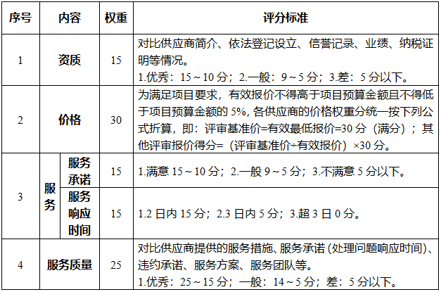 采取云南滇中beat365平台_best365官网登录下载_beat365唯一官网政务服务局内控比选采购的方式,由云南滇中beat365平台_best365官网登录下载_beat365唯一官网政务服务管理局评审小组根据供应商提供的资料,依据资质、报价、服务承诺等因素进行综合评议,最终确定供应商,并按照云南滇中beat365平台_best365官网登录下载_beat365唯一官网政务服务管理局务会议审议同意的采购计划中相关要求签订合同,合同签约委托局分管领导签订,按合同约定期限履行。项目评审评分标准如下: